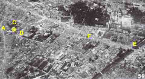 巣鴨の焼け跡の写真 ( 昭和20年4月の空襲 )![]() 昭和20年 ( 1945年 )4月13日の夜間空襲の際には、 B−29 爆撃機 352機 が攻撃をおこないました。合計 2,119 トン の爆弾、焼夷弾を 投下しましたが、その結果私達の家や学校があった豊島区を初め、文京区、新宿区一帯が焼け野原になりました。後日その戦果を確認するために、米軍は写真撮影をし ましたが、それがこの写真です。