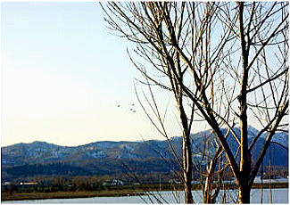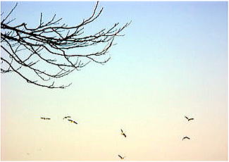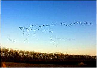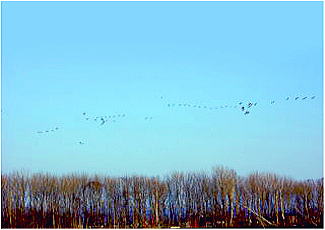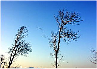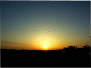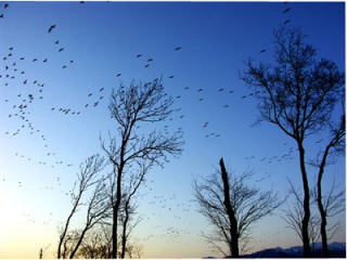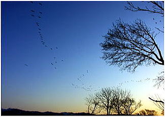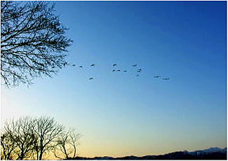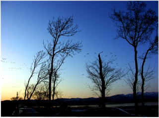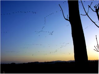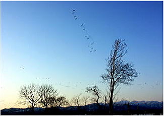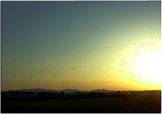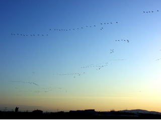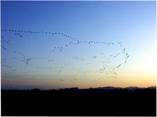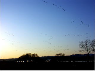 見事な編隊で 何十何百羽かの仲間が、この沼を目がけて降りてきます。夜も仲間がいる事で安心なんだろうね。