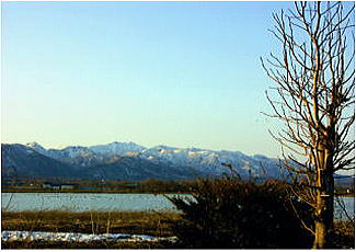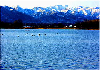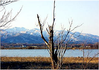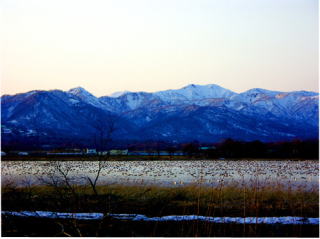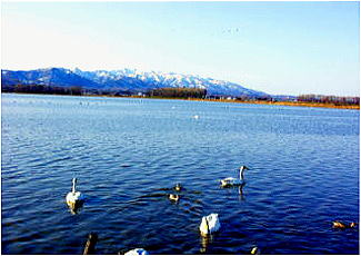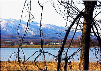 ピンネシリの山々に残雪が見え綺麗に写っています。 餌を満喫した渡り鳥がバラバラに沼へ戻っている。