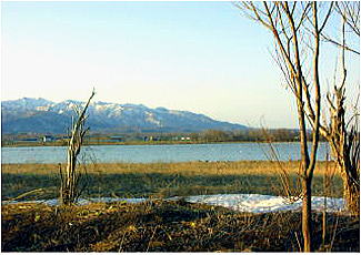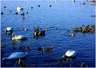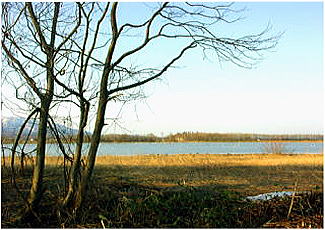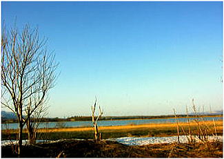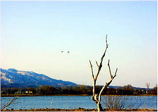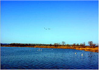 枯れ草が絨毯の様に沼の周り一面にある、 この静かな沼に朝夕騒音が轟く! 四方八方から渡り鳥が・・・