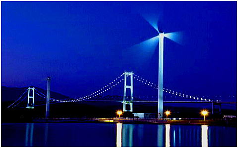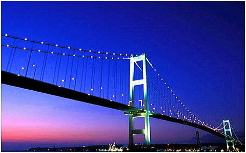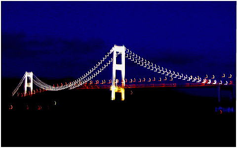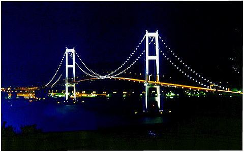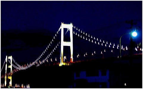 日も落ちて、白鳥大橋もライトアップ・三脚で撮っていると強い風が・・・やはりブレた〜。