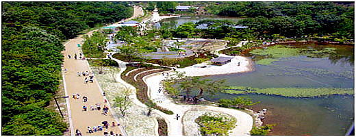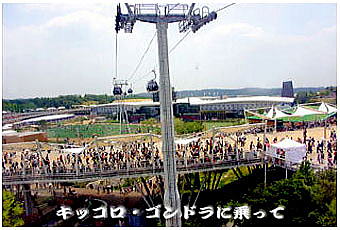 ゴンドラに乗るまで50分、長蛇の列です。 広い〜 歩いて移動する人達 (ゴンドラ上から)