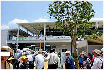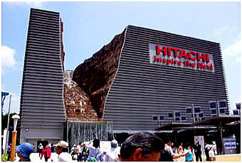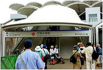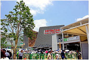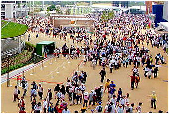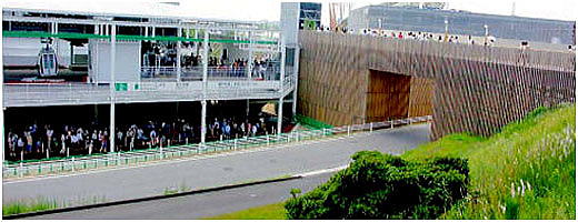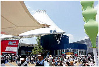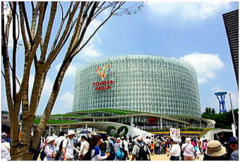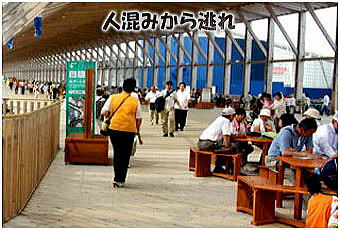 トヨタ館前にも人が一時間待ち。(先に何か食べようよ。) 食べ物店も長い列だよ。