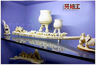 ケースにライトアップされ綺麗です。牙細工も見事な美しさ!。疲れた〜〜座る所は?