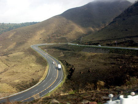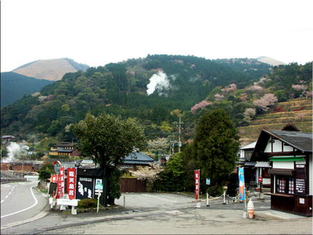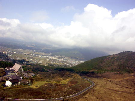 木の無い山が続く、やまなみハイウェイを走ってます。 眼下には黒川温泉郷がみえてます。