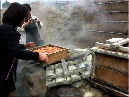 地下から噴き出る蒸気で玉子を蒸す、お姉さん。 それをデジカメで撮っている人! 硫黄の匂いがすごいです。