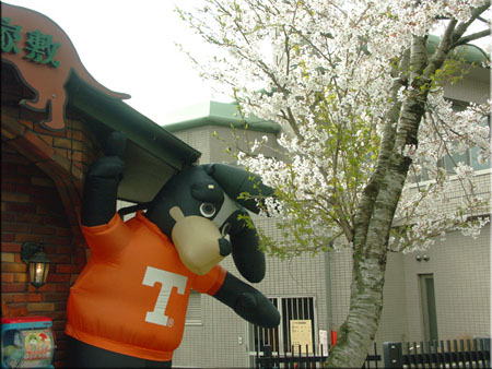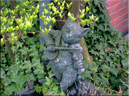 由布院の猫屋敷だって、 遅咲き桜とビニールで作った犬。 猫屋敷で見たバイオリンを弾く猫だよ・・・