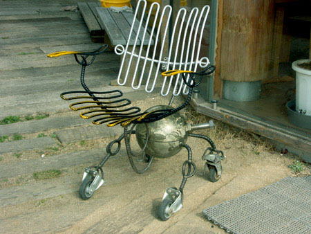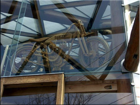 ガラス窓にフレームを木で作った二輪車、走るの?「展示用」 面白いね〜 変形 車椅子?座ると痛かったよ。
