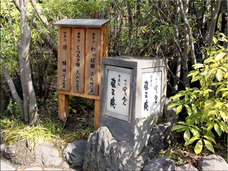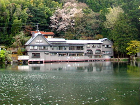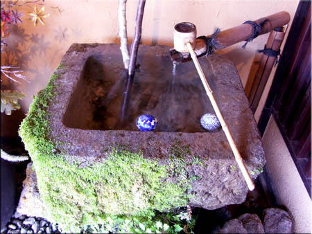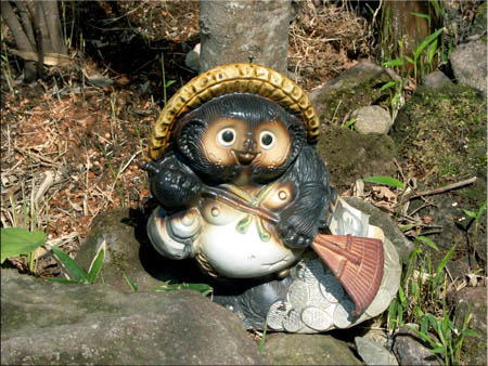 金燐湖・豊の国 (レストラン、らんぷ舎)古いのかな? 岩の横に、(まめたぬき) お掃除 狸、可愛いですね。