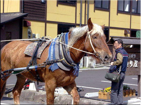 湯布岳からの伏流水が冷たかった。 湧き水はどこも綺麗だね。 辻馬車がお客を乗せ歩いています。