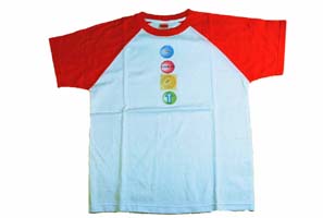 色はラグラン袖で袖の色がオレンジ・紺・赤・青(身頃は全て白)